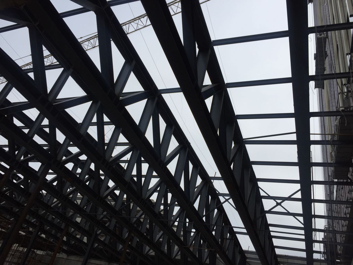項(xiàng)目總占地面積19.98畝,其主體擬建一座五星級(jí)賓館,總建筑面積約61150平方米(其中地上40235平方米,地下20915平方米)。地下2層,主樓地上24層,建筑高度98m,裙房地上5層,建筑高度32m。裙樓鋼結(jié)構(gòu)屋蓋為空間桁架結(jié)構(gòu),包含16榀平面桁架及桁架間垂直及水平支撐。桁架最高點(diǎn)處標(biāo)高32.138m,長度31m,高度2.2m~2.96m之間,桁架下弦支承于標(biāo)高28.772m的混凝土梁上。
