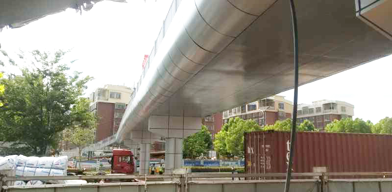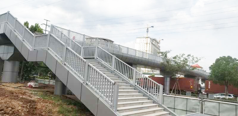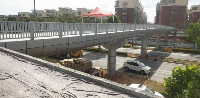 西城路(涌金大道-聚寶路)人行過街設(shè)施建設(shè)工程人行天橋平面呈“一”字型布置,上部結(jié)構(gòu)采用等截面箱型結(jié)構(gòu),梁1.0m,跨徑布置為17.35+16.5+16.5+18.55m(兩端均設(shè)挑臂)。天橋總長為72.7m,總寬5.3m,斷面布置形式為0.15m(欄桿)+5.0m(人行道)+0.15m(欄桿)。